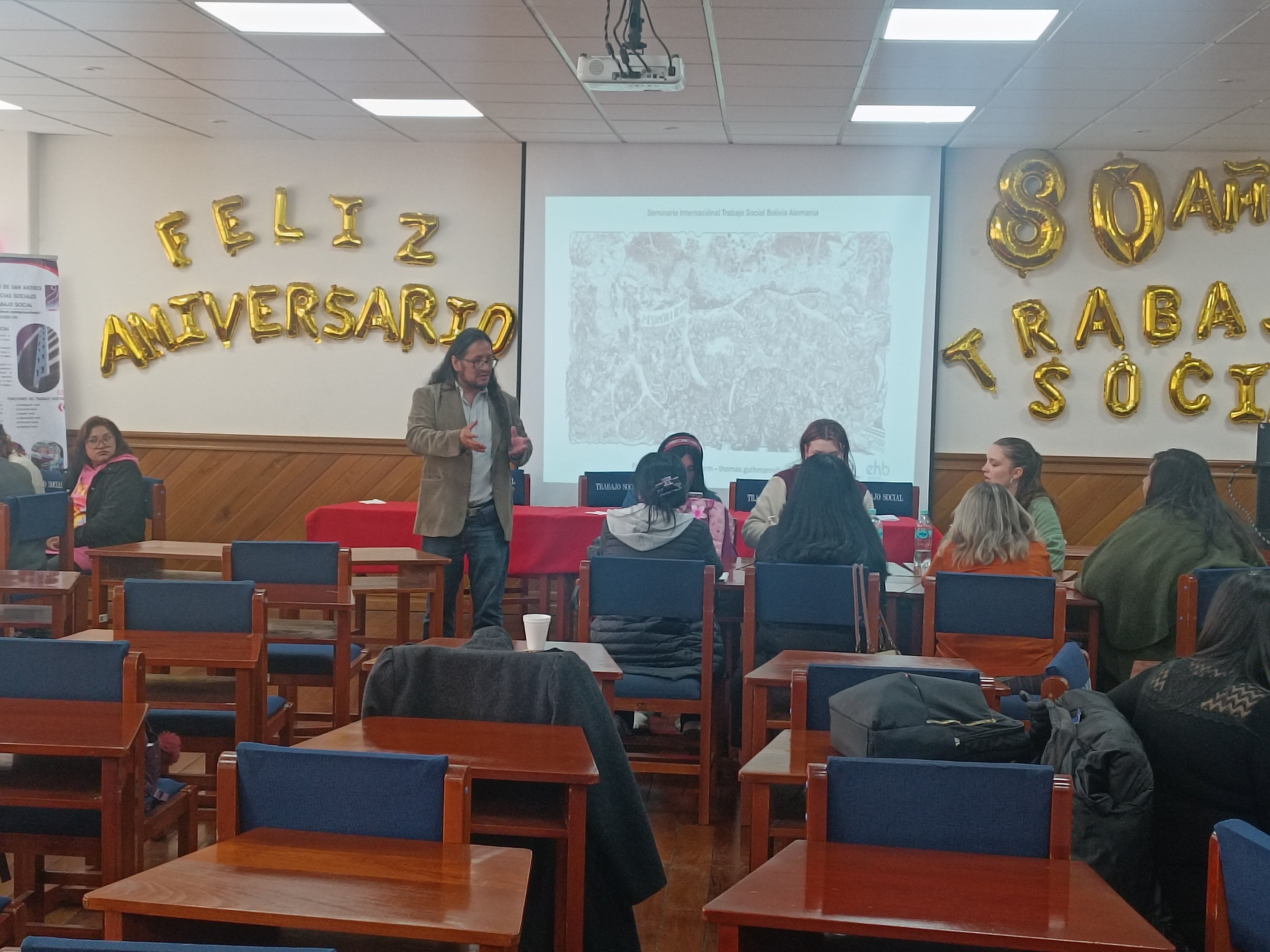 Am 26. Februar 2026 fand an der Universidad Mayor de San Andrés ein internationales Seminar zur Sozialen Arbeit mit Teilnehmenden aus Deutschland und Bolivien statt. Organisiert wurde die Veranstaltung von Dr. Marcela Molina, Direktorin des Studiengangs Soziale Arbeit der UMSA, Dr. Boris Chamani (UMSA) und Prof. Dr. Thomas Guthmann, Professor für Gestaltungspädagogik an der EHB. An dem Seminar, das von der Deutschen Deutschen Botschaft in La Paz unterstützt wurde, nahmen acht Studierende aus der EHB teil.